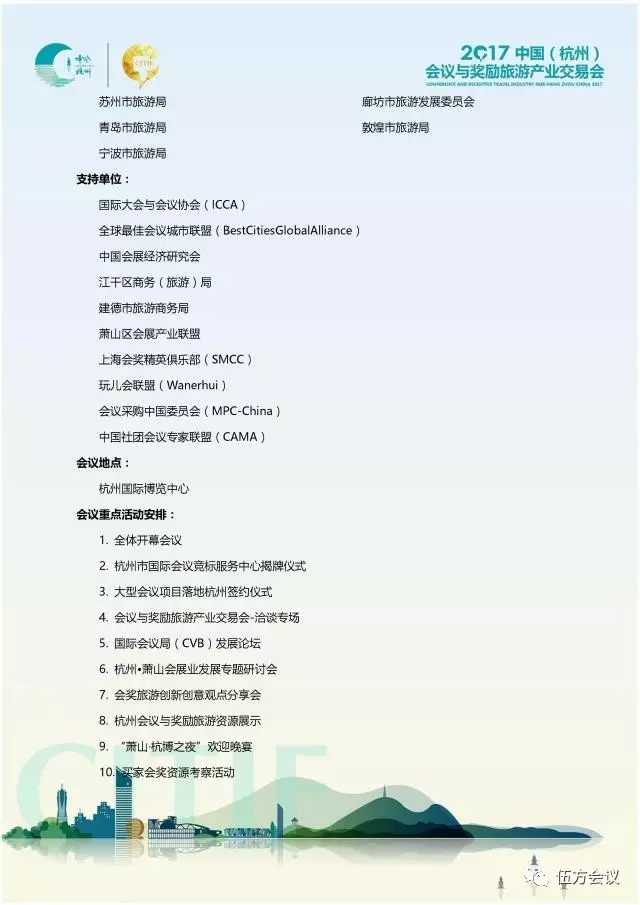 活動(dòng)參會(huì)人數(shù)規(guī)模預(yù)估將達(dá)到500多人,在得到了國(guó)內(nèi)眾多會(huì)獎(jiǎng)旅游城市支持的同時(shí),還得到了像國(guó)際大會(huì)與會(huì)議協(xié)會(huì)(ICCA)全球最佳會(huì)議城市聯(lián)盟等國(guó)際機(jī)構(gòu)的支持,云集了行業(yè)眾多精英與國(guó)內(nèi)外大咖蒞臨現(xiàn)場(chǎng)參會(huì),共同為杭州乃至華東地區(qū)的會(huì)議與獎(jiǎng)勵(lì)旅游產(chǎn)業(yè)發(fā)展獻(xiàn)言獻(xiàn)策,進(jìn)行洽談與合作,并帶來(lái)寶貴的發(fā)展經(jīng)驗(yàn)。