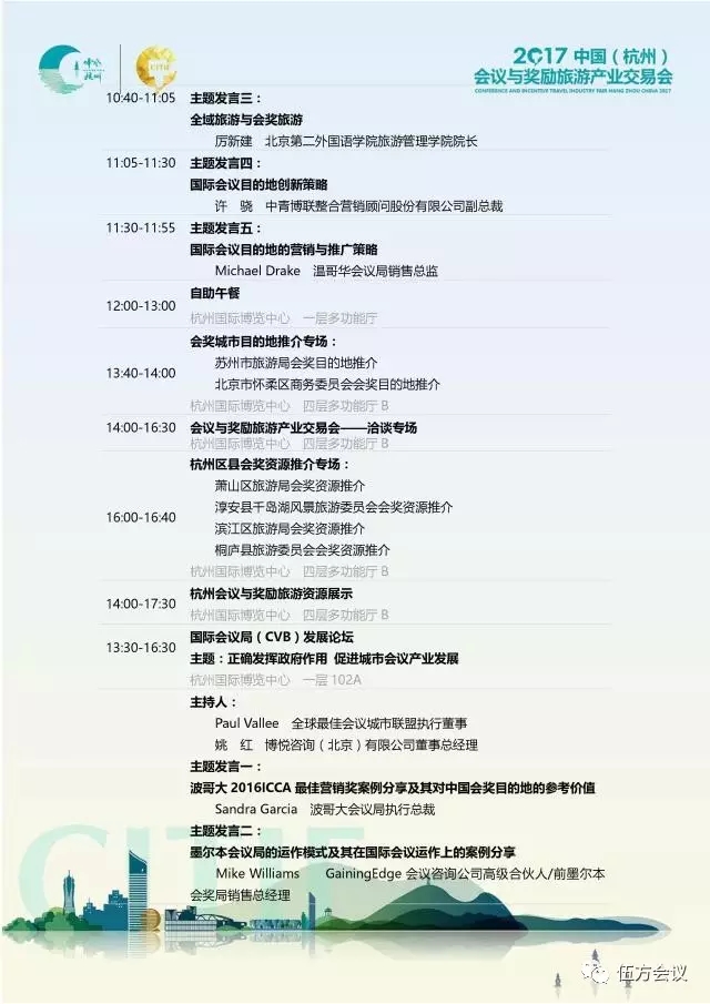 特別邀請(qǐng)到亞太、歐美、非洲等主要城市會(huì)議旅游局、駐華機(jī)構(gòu)及國(guó)際會(huì)獎(jiǎng)旅游組織相關(guān)負(fù)責(zé)人,相聚杭州,探討行業(yè)發(fā)展。